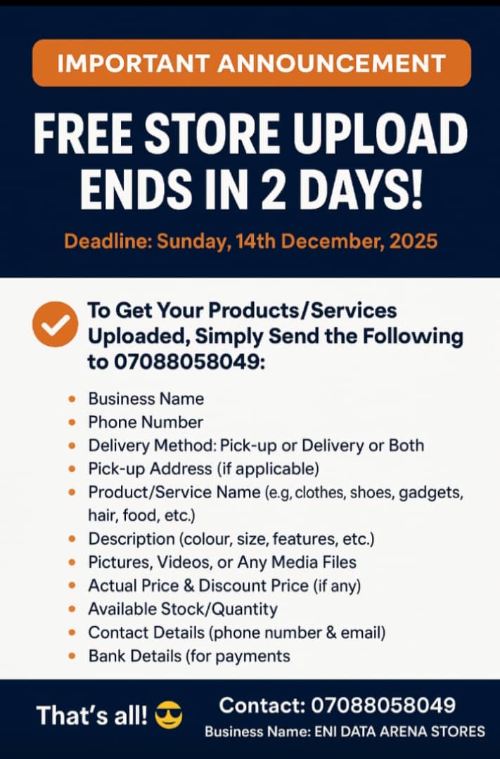 Business owners, this is your final opportunity to get your products and services uploaded FREE on ENI DATA ARENA STORES before the free upload window closes in just 2 days!